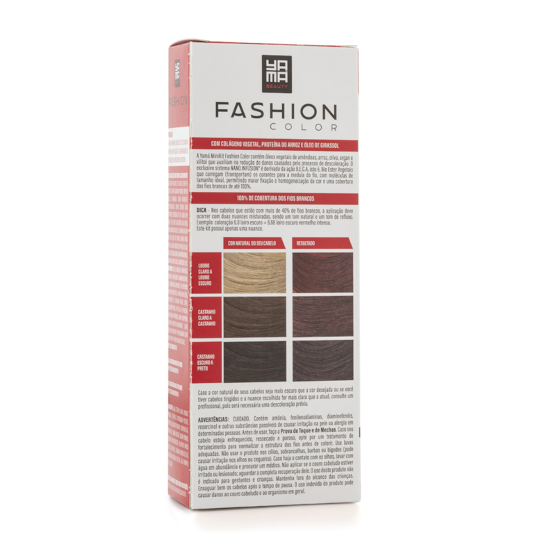 COLORAÇÃO CREME YAMÁ FASHION COLOR 60G: ÁGUA, ÁLCOOL CETOESTEARÍLICO, ÁLCOOL CETÍLICO, CETOMACROGOL 1000, MONOESTEARATO DE GLICERILA, HIDRÓXIDO DE AMÔNIO, PROPILENOGLICOL, ETANOLAMINA, METABISSULFITO DE SÓDIO, POLIQUATÉRNIO-22, COPOLÍMERO DE ÁCIDO METACRÍLICO E ACRILATO DE ETILA, ERITORBATO DE SÓDIO, EDETATO DE SÓDIO, MACROGOL, LAURILSULFATO DE SÓDIO, OLIVATO DE ETILA, GOMA DE ACACIA SENEGAL, GLICEROL, ÓLEO DE AMÊNDOAS, ETIL ÉSTER DO ÓLEO DE AMÊNDOA, ÉSTERES ETÍLICOS DE CERA DE FARELO DE ARROZ, ÉSTER ETÍLICO DE PALMA, ÓLEO DE HÍBRIDO DE HELIANTHUS ANNUUS, ÁLCOOL ETÍLICO, PROTEÍNA DO ARROZ HIDROLISADA, ÁCIDO GLICÓLICO, ÁCIDO LÁCTICO, SORBATO DE POTÁSSIO, ÓLEO DA SEMENTE DE ARGANIA SPINOSA, ÓLEO DA SEMENTE DE SIMMONDSIA CHINENSIS, BENZOATO DE SÓDIO, XILITOL. PODE CONTER: SULFATO DE TOLUENO-2,5-DIAMINA, 4-AMINO-M-CRESOL, RESORCINA, P-FENILENODIAMINA, CLORIDRATO DE 2,4-DIAMINOFENOXIETANOL, P-AMINOFENOL, 2-METILRESORCINA, 4-AMINO-2-HIDROXITOLUENO, 5-AMINO-6-CLORO-O-CRESOL, SULFATO DE 1-HIDROXIETIL 4,5-DIAMINO PIRAZOL, 2,6-DIAMINOPYRIDINE, EDARAVONA, 2-AMINO-6-CLORO-4-NITROFENOL, 2-AMINO-3-HIDROXIPIRIDINA, SULFATO DE 2-AMINO-4-HIDROXIETILAMINOANISOL, SULFATO DE N,N-BIS(2-HIDROXIETIL)-P-FENILENODIAMINA, SULFATO DE HIDROXIETIL-P-FENILENODIAMINA.
