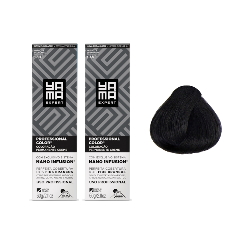 O Kit com 2 Colorações Nano 1.1 Preto Azulado da Yamá Professional Color foi desenvolvido para quem busca um preto intenso com reflexos azulados profundos e sofisticados. A coloração creme Nano Infusion contém ingredientes vegetais que tornam o processo de coloração ainda mais efetivo, com o exclusivo sistema Nano.Infusion® derivado da ação B.E.C.A (Bio Ester Vegetais Carregadores de Ativos). Esta tecnologia sustentável transporta os corantes para a medula do fio com moléculas de tamanho ideal, permitindo maior fixação, homogeneização da cor e resultados duradouros, sendo obtida dos óleos vegetais de Amêndoas, Arroz, Oliva, Argan e Xilitol, um açúcar altamente doador de brilho. A fórmula proporciona cores duráveis, brilho extraordinário, hidratação profunda e maciez extrema, minimizando os danos causados pelo processo de coloração e pelo dia a dia, com cobertura de fios brancos em até 100%. Ideal para conquistar um preto azulado intenso, uniforme e luminoso, garantindo um resultado elegante e cheio de personalidade.