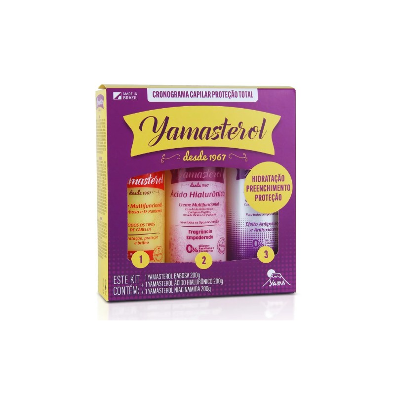 O novo Kit Yamasterol foi desenvolvido para potencializar seu cronograma capilar com reparação intensa, priorizando as três etapas essenciais: hidratação, nutrição e reconstrução. Com três multifuncionais icônicos, este kit oferece tratamento completo para devolver a saúde, o brilho e a vitalidade dos seus fios. Yamasterol Babosa (Amarelinho): Enriquecido com Babosa e D-Pantenol, este multifuncional é um poderoso hidratante e antioxidante natural, rico em vitaminas A, C, E e complexo B. Hidrata, protege, desembaraça e proporciona brilho intenso, sem parafina e silicone. Yamasterol Ácido Hialurônico: Com Ácido Hialurônico, Colágeno Vegetal, Óleo de Rícino e D-Pantenol, oferece hidratação profunda com ação regeneradora e preenchedora. Recupera o brilho, a maciez e a densidade dos fios, deixando-os mais resistentes, encorpados e revitalizados de dentro para fora. Yamasterol Niacinamida: Enriquecido com Niacinamida (Vitamina B3), poderoso agente antioxidante que protege os fios contra os danos dos radicais livres gerados pela poluição, luz azul e radiações solares UVA