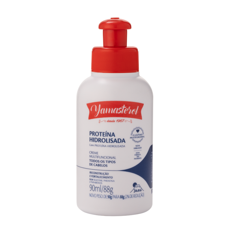 O Creme Multifuncional Yamasterol Proteína Hidrolisada é poderoso. Além de todas as propriedades do tradicional, tem também efeito reconstrutor da proteína e protege os fios deixando-os mais luminosos e hidratados. Por isso, pode ser usado como condicionador, pré-shampoo, máscara de reconstrução no cronograma capilar e creme para pentear.
